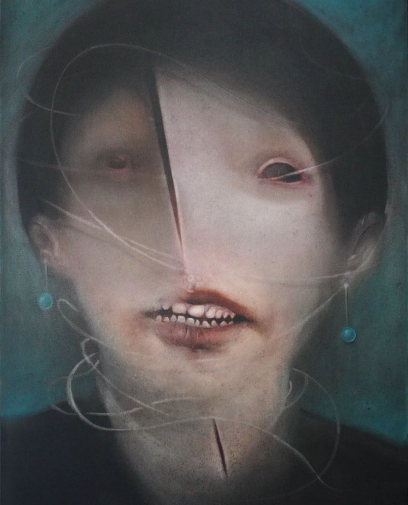 “Through my paintings, I aim to express both despair and hope for life using colours and elements. For instance, the eyes often appear empty but not blind, and the characters convey a sense of depression and worry without being entirely hopeless. Despite their struggles, these individuals dress up and apply makeup daily, showing a determination to preserve their beauty and their lives,” he asserts.
